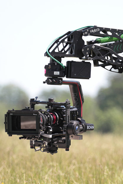 There are several ways to attach your gimbal to the Hybris shock absorber. The included base plate has hole patterns to match the Freefly Toad in a hole and Cinemilled Universal Ronin mount for easy attachment of the MoVI and Ronin gimbals. We also make a Mitchell female mount for gimbals that uses the Mitchell connector.