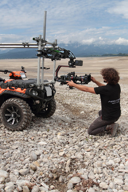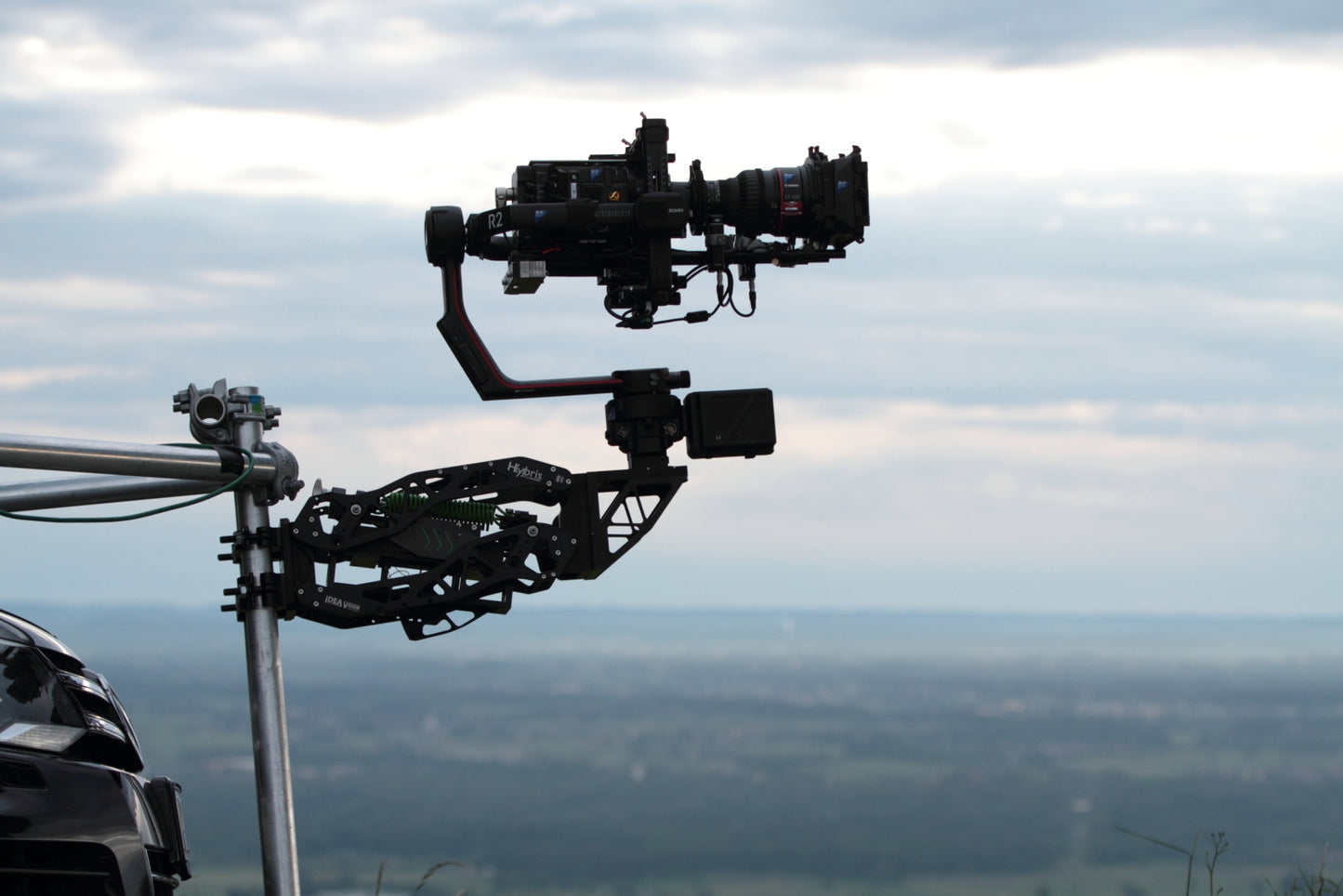 IDEA VISION ́s Hybris is custom designed to reduce high and low frequency vib- rations and hard impact shocks typically experienced when shooting from mo- ving platforms on rough terrain or paved roads. The front mount can be set for under or overslung use of any camera, gimbal or stabilized head.