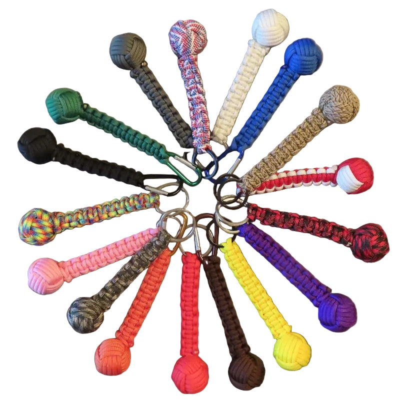 Compact and versatile, this monkey fist key chain features a solid 1-inch steel ball wrapped in durable 550 paracord. At 5–6 inches, it's sized for easy carry on belts, bags, or packs. Select from black or silver key rings, or choose a colored carabiner that matches your monkey fist shade. Built tough for crews who need reliable gear that doubles as a practical tool.