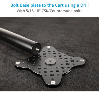 The base plate needs to be bolted to your cart using 5/16-18" CSK/Countersunk bolts and requires that you drill 4 holes (11/32" is a good fit) in the top shelf of your cart.